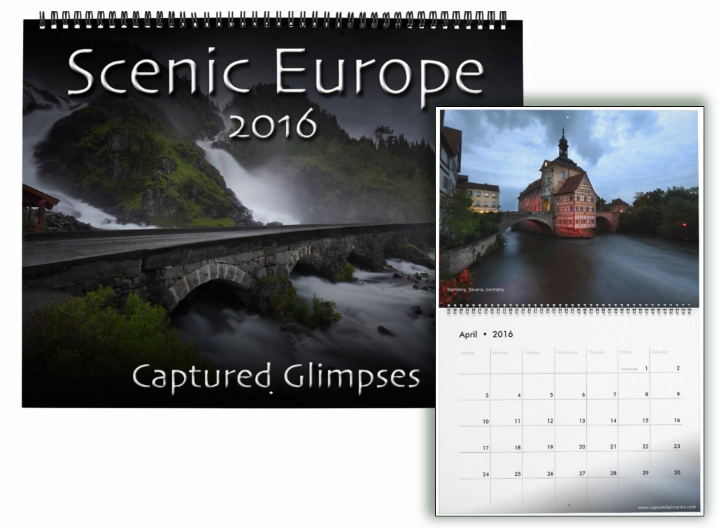 I've received a few requests over the last year to do a wall calendar.  Even though we all have online calendars and schedules on our phones, wall calendars still have some appeal.  Scrolling through the year on a phone doesn't have the same satisfaction as flipping the page over every month.  So, I'm happy to announce that my 2016 Scenic Europe calendar is now available!